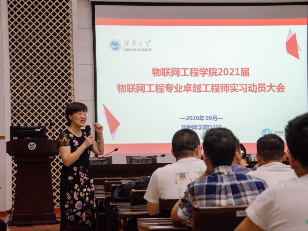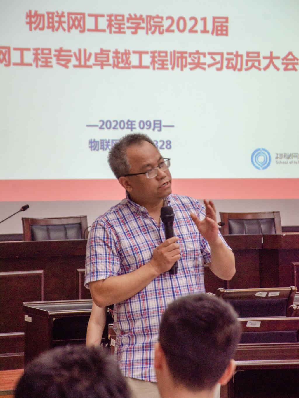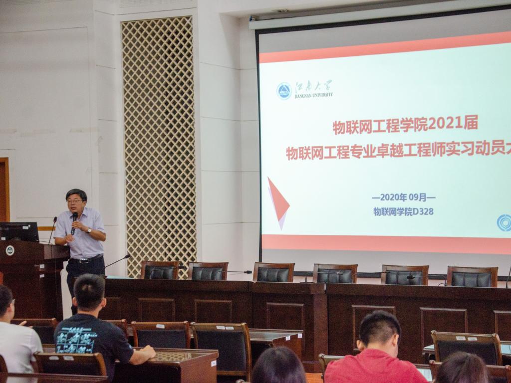 朱启兵结合自身求学、执教经历,回顾了物联网工程专业的创立、发展历程,从为什么要实习、如何实习、实习效果三个维度全面地介绍了实习工作。他指出,公司的物联网工程专业是国家特色专业、教育部首批“卓工计划”、首批“专业综合改革试点”专业,他希望同学们统一思想,始终以爱校荣校、爱院荣院的深厚感情,饱满的工作热情、高度的责任感和使命感投身到工程实践中,在校内导师和企业导师的指导下,顺利的完成实习工作。