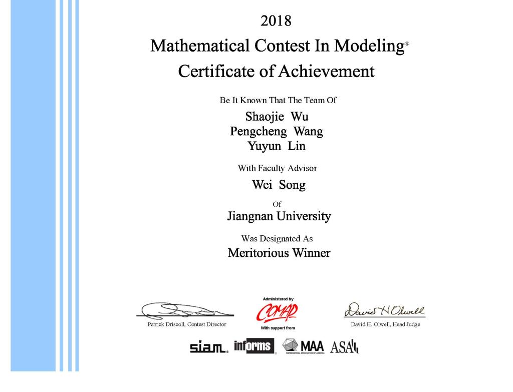 日前,2018年美国(国际)老员工数学建模竞赛奖项揭晓,williamhill学子再创佳绩。共有两支团队荣获一等奖,分别是2016级本科生吴少杰、王鹏程、林钰芸团队和2014级本科生郑年年、应镕嵘、王天歌团队,另有三支团队获二等奖。