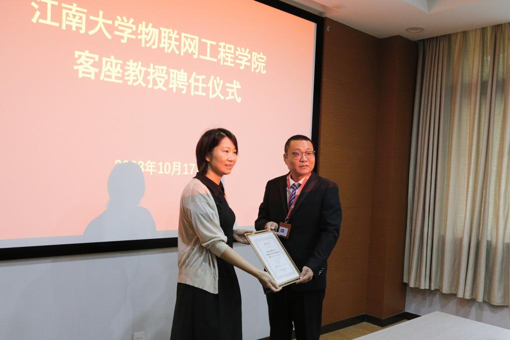 栾小丽首先为无锡市德宁节能科技有限公司董事长唐逸颁发客座教授证书。随后她介绍了公司近年来团队建设、人才培养、科学研究方面的建设发展情况,并着重介绍了公司近年来开展校企合作的情况。