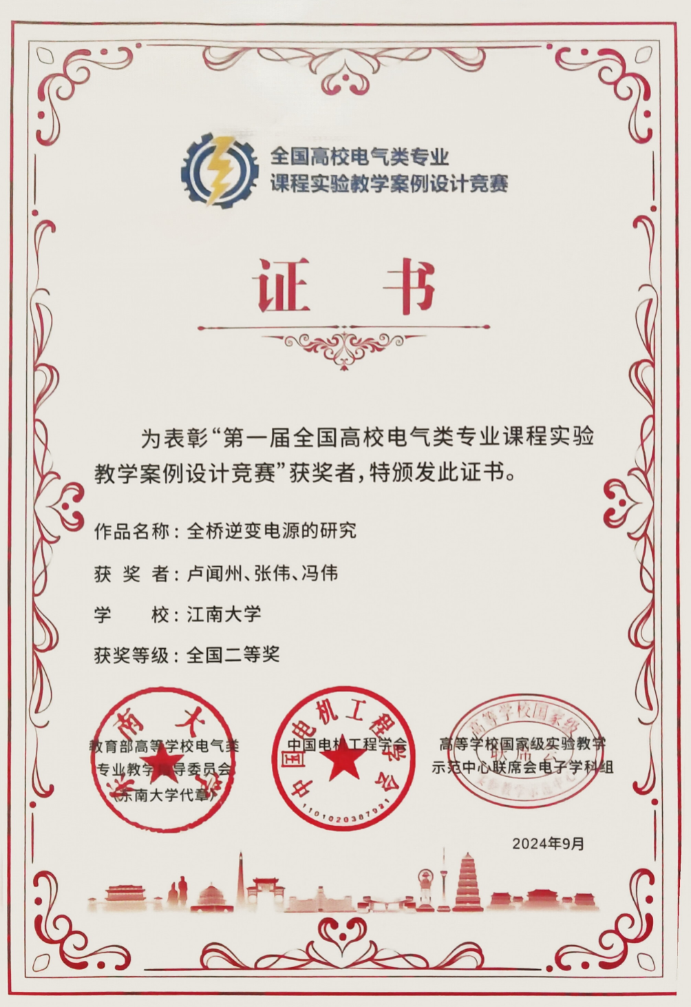 近日,第一届全国高校电气类专业课程实验教学案例设计竞赛在西安交通大学创新港校区成功举办。由卢闻州、张伟、冯伟组成的团队代表威廉希尔参赛,其案例“全桥逆变电源的研究”荣获全国二等奖。