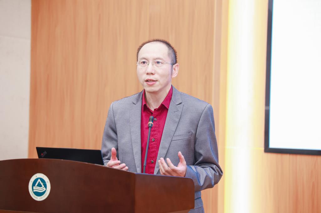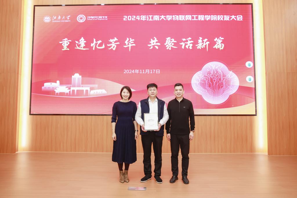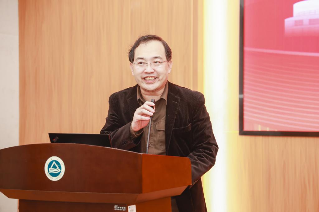 王伟民作分享报告。他衷心感谢母校、感谢老师和同学在自己学习成长和企业发展过程中给予的关心和帮助。他表示将通过员工会,加强校企间合作交流,努力服务社会、回馈母校。