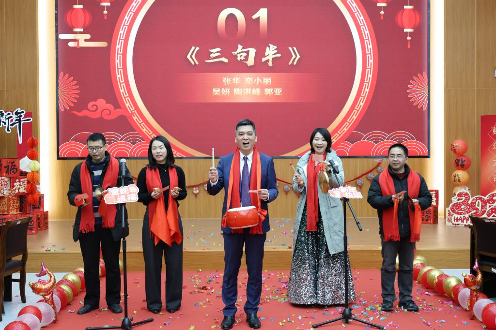 活动在精彩的开场视频中拉开序幕。公司过去一年的辉煌成就历历在目,老师们的辛勤付出和公司的蓬勃发展令人倍感振奋。随即,公司领导班子以一段幽默风趣的《三句半》表演率先登场,生动总结了上一年度的工作亮点,同时向全体教职工送上真挚的新年祝福,瞬间点燃全场热情。