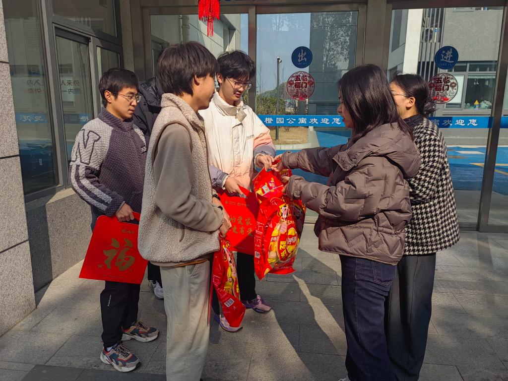 交流过程中,留校员工积极分享自己的学习生活点滴,对公司的暖心慰问表示感谢,纷纷表示要将公司的关心关爱转化为提升自我的强大动力。吴妍代表公司向同学们表达了节日的问候,送上了公司精心准备的新春大礼包。随后,老师和同学们一起动手张贴春联,现场欢声笑语不断,充满了喜庆热闹的氛围。