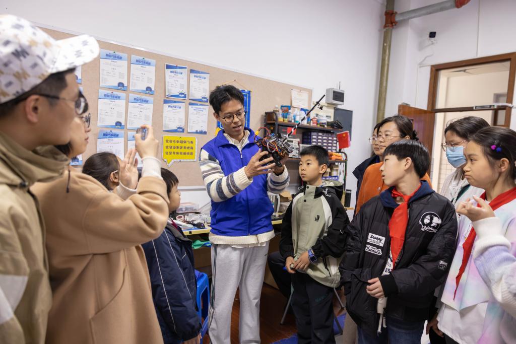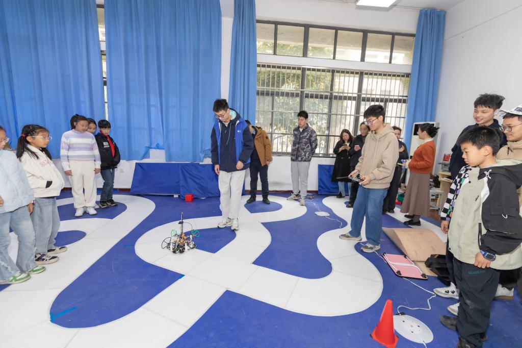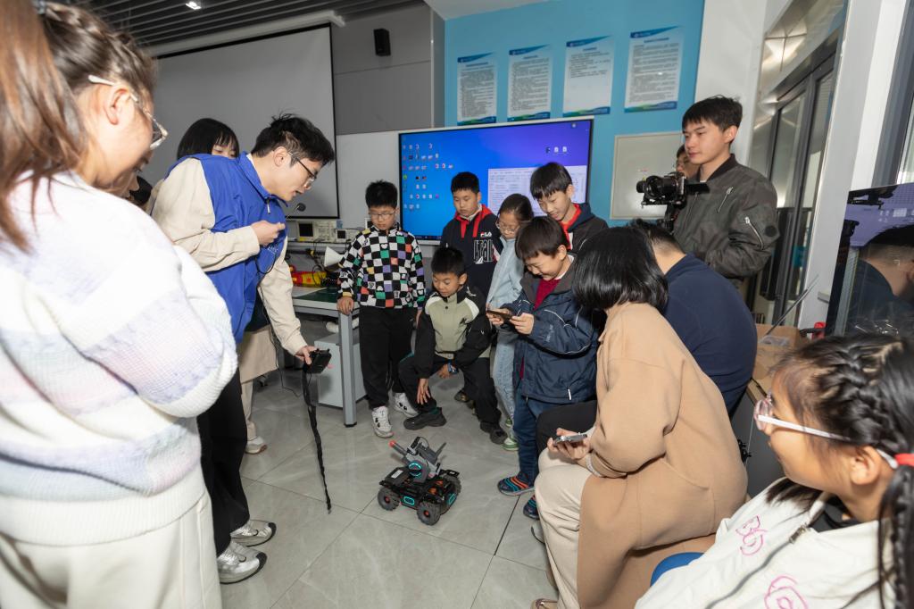 物联网老员工创新实践基地的科技探秘是此次研学的亮点。走进电子设计俱乐部,各种实验仪器揭开了电子技术的神秘面纱。在智能车和机器人俱乐部里,孩子们围绕智能循迹车、四足机器人、无人机、气垫船等科技作品的工作原理和弹跳结构的机械奥秘展开热烈讨论和互动交流。启发式的教学让抽象的理论知识在互动中转化为可感知的科技实践,充分培育了孩子们的科学思维。