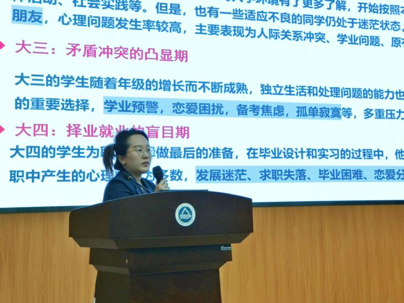 接着,公司心理辅导员张圆化身心灵引路人,围绕角色定位和工作职责、常见心理问题识别、朋辈互助技能、心理危机干预以及校内外心理援助资源等方面展开详细讲解,她聚焦心理问题线索挖掘、识别技巧及应对策略,通过理论讲授与案例解析相结合的方式,有效提升了寝室长及班级心理委员工作能力和水平。此外,张圆分享了一系列生活实用的心理保健方法,引导大家学会觉察自身情绪状态、重视自我身心关照。最后,张老师又介绍了公司心理健康教育工作站的建设情况、梳理本学期心理专题活动,引导宿舍长主动关注并投入心理主题活动,共同营造身心健康、互助友爱的校园氛围。
