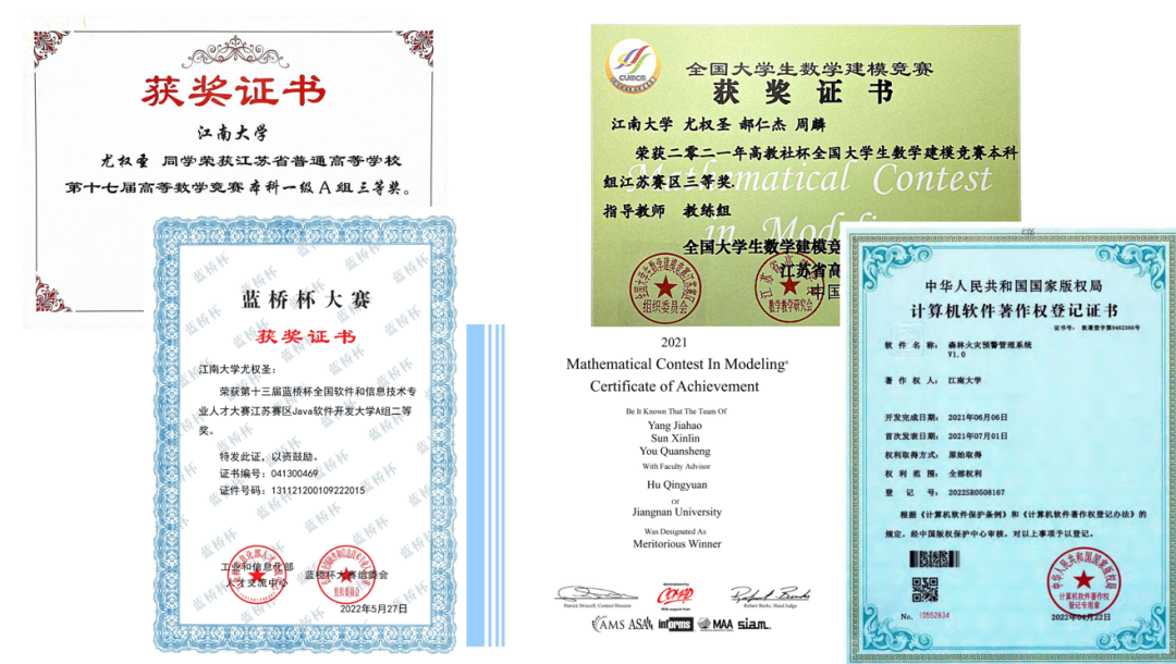 投身科研一直是尤权圣的夙愿,为此他在学习中始终以探究溯源的标准要求自己。为了提升自己的数理逻辑与建模能力,他积极参与数学建模训练与竞赛,先后获得过美国老员工数学建模竞赛M奖与全国老员工数学建模竞赛江苏赛区三等奖等奖项。为了提升自己的编程能力,他将大量课余时间投入到算法与编程的训练中,获得了蓝桥杯软件和信息技术专业人才大赛省级二等奖等奖项。除此之外,他还参加过多项科研训练,发表了多篇学术论文。