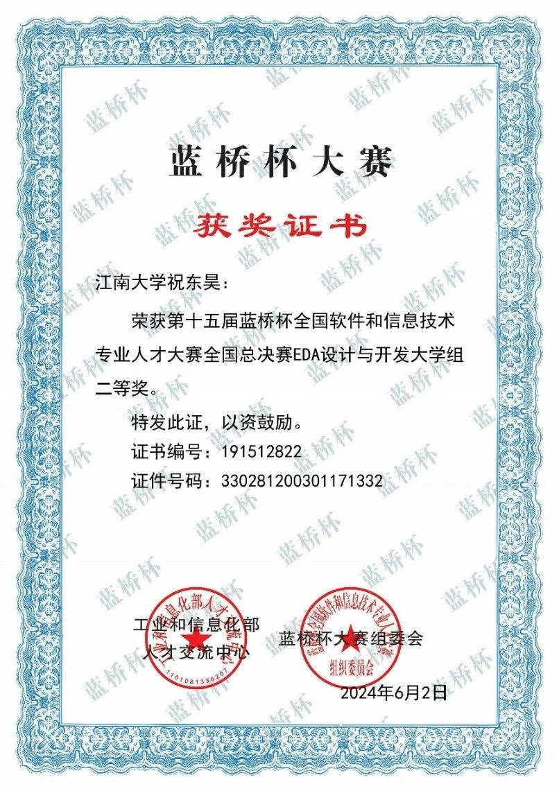 祝东昊,物联网工程专业2021级本科生。推免综合成绩物联网专业排名第一,曾获本科生国家奖学金、williamhill威廉希尔一等学业奖学金、金龙鱼奖学金、校级三好员工荣誉称号。大学期间积极参与科研竞赛,完成校级大创一项,获得国家级奖项三项和省级多项。曾获2023全国老员工电子设计大赛二等奖,江苏省一等奖;2024全国蓝桥杯大赛EDA赛道二等奖,江苏省一等奖;2023全国蓝桥杯大赛嵌入式赛道优秀奖,江苏省一等奖等。在学业之余积极参与员工工作,入学以来担任班长,校电子设计俱乐部副部长,班主任助理等职责,组织和带领物联网2101班获校级先进班集体。现推免至东南大学。