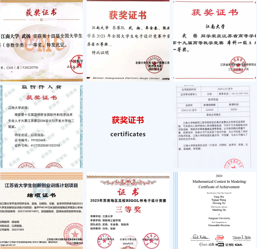 在俱乐部里,他结识一群志同道合的伙伴,实验室的无数个黑夜,成了他们并肩作战的时光胶囊。大家一起头脑风暴、调试设备、优化方案,在一次次尝试与失败中摸索前行。功夫不负有心人,他先后荣获第四十届美国老员工数学建模竞赛二等奖、第十四届全国老员工数学竞赛一等奖、第十九届江苏省高等数学竞赛一等奖、2023 年江苏省电子设计竞赛二等奖等 7 项省级及以上奖项。尤为值得一提的是,他参与的“大创” 项目—— 基于 FMCW 毫米波雷达非接触式的呼吸、心率高精度监测系统取得重大突破,研发成果正式在企业落地应用,实现从校园创新到市场实践的跨越。
