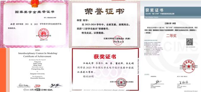在与标签的抗争中,林莹慢慢找回了自己的节奏,她的努力也开始有了回报。GPA重回年年级第六,竞赛之路也从校赛的鼓励奖起步,历经省赛落榜后认真复盘每一次失败的原因,总结经验教训,不断提升自己的能力,持续奋战,最终勇夺国际二等奖。不仅如此,她还以第一作者身份发表 EI 会议论文,并成功申请国家发明专利。这些成果的背后,是她无数个日夜的付出和努力。最终,她以专业综合排名第二的成绩,成功推免至中国科学技术大学,继续她的控制之旅。她用汗水与坚持诠释了,只要心怀勇气、不惧挑战,就能在逆境中实现华丽转身。