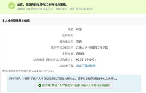 林莹被推免至中国科学技术大学