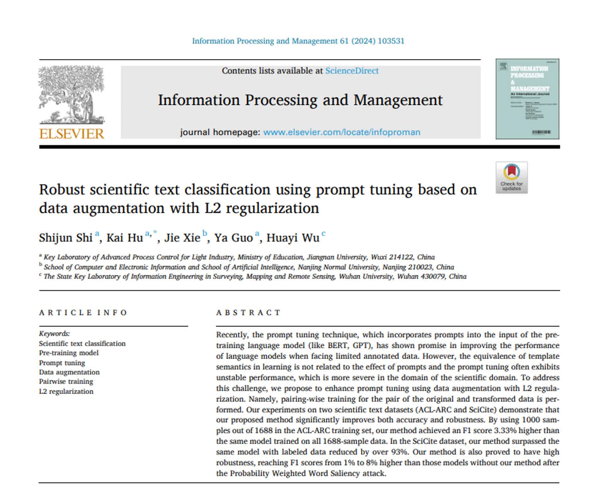 【交汇点新闻12月5日】在文字语言信息的海洋中,一种新的数据增强和训练策略或许可以让人工智能更聪明。近日,威廉希尔2020级本科生时世骏以第一作者身份在《信息处理与管理》(中科院一区,IF=8.6)发表题为“使用基于数据增强和L2正则化的提示学习进行鲁棒的科学文本分类”的学术论文,,该期刊是Elsevier出版社旗下信息科学领域的权威期刊之一。williamhill胡凯副教授为该文通讯作者。