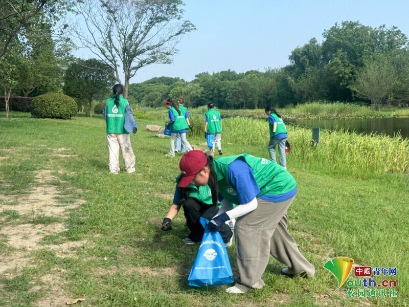 图为实践团成员在太湖大堤沿河岸净滩。樊铭举 供图