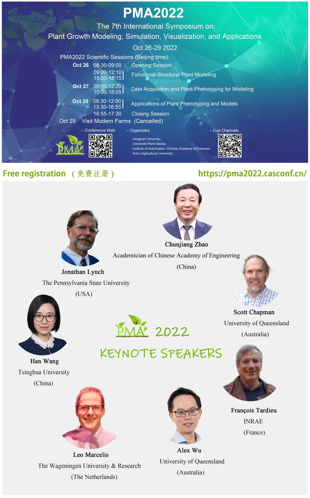 第七届植物生长建模、仿真、可视化与应用国际研讨会(PMA2022)将于2022年10月26日-29日以线上的方式举行。PMA2022由williamhill威廉希尔、法国巴黎萨克雷大学、中科院自动化所、安徽农业大学联合举办,会议报告采取全英文的方式,全球直播。作为一个国际平台,PMA2022汇集了来自全球各地的杰出科学家,讨论与探索植物模型的前沿科学技术,包括从分子到生态系统尺度的建模理论、计算算法、模拟技术和可视化方法等,以推进生命科学、计算机、物联网、自动化等学科交叉,促进农业智能化与可持续发展。